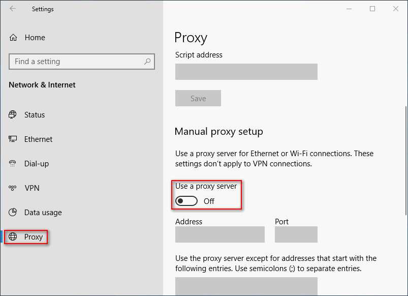 - Переключите переключатель Используйте прокси-сервер к Выключено .