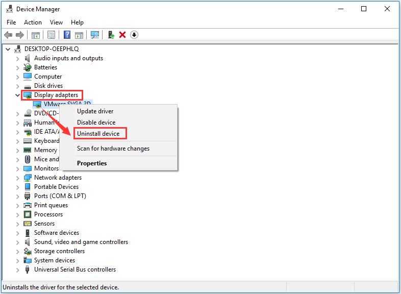 Step 2: In the interface of Device Manager, find and expand Display adapters. Then right-click the display driver under this section, and choose Uninstall device from the context menu.