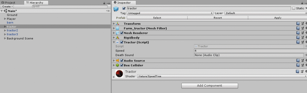 - Теперь выберите три объекта GameObject для трактора и отметьте галочкой поле «Death Sound» компонента «Tractor» в Инспекторе.