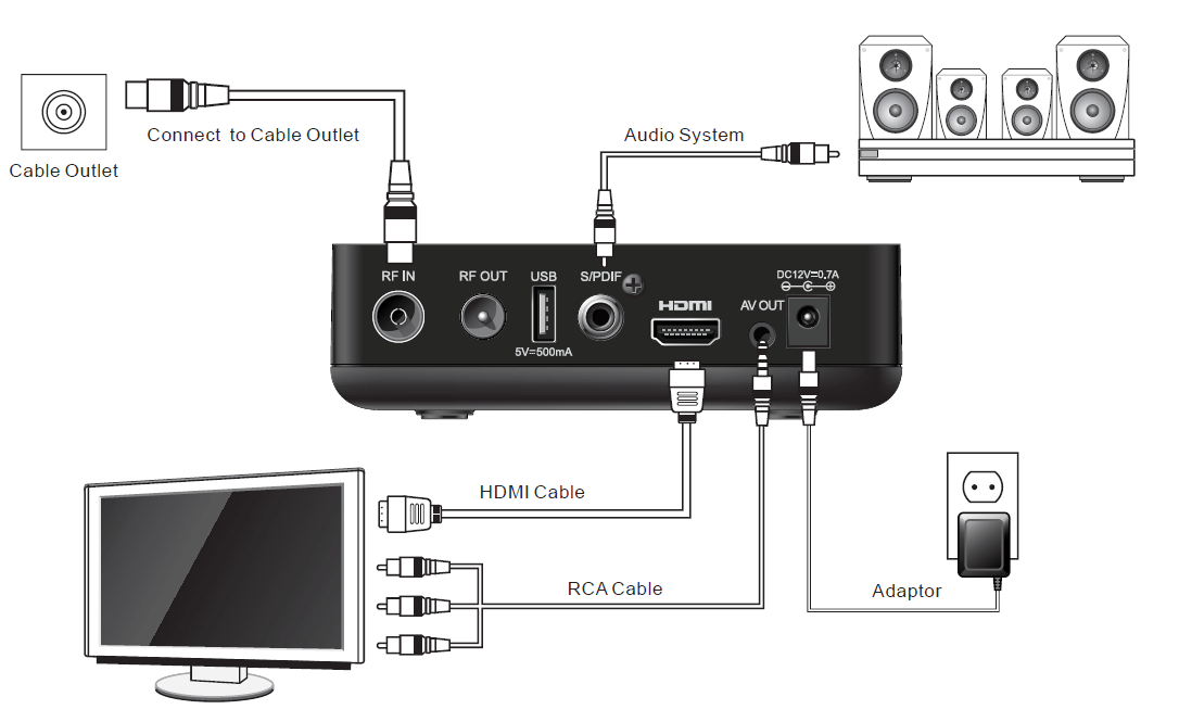Антенна подключается к радиочастотному гнезду, а кабель HDMI соединяет тюнер с монитором. Если нужны внешние динамики, их можно соединить с телеприемником, который сам извлечет звук из телевизионного сигнала. После подключения, чтобы выбрать правильные входы и выходы, придется зайти в меню устройства.