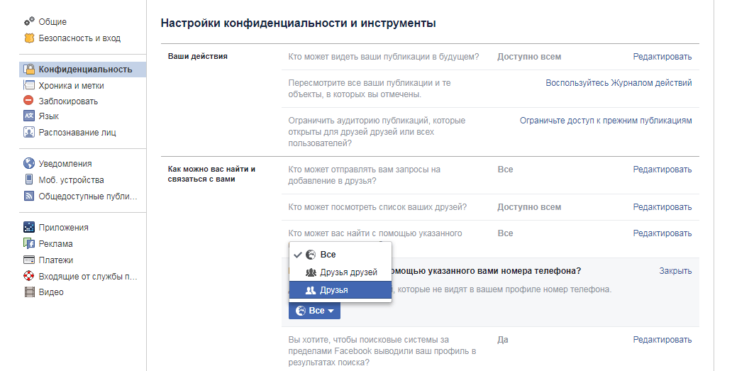 В настоящее время Facebook предоставляет пользователям несколько вариантов того, кто может найти их на Facebook по номерам телефонов. Варианты включают друзей, друзей друзей и всех.