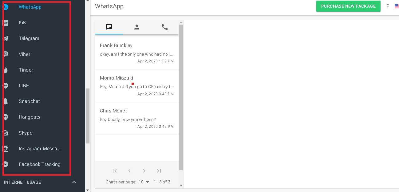 Помимо основных разделов, на боковую панель отдельным списком вынесены все мессенджеры, что очень удобно для пользователя и отличает программу mSpy от конкурентов.