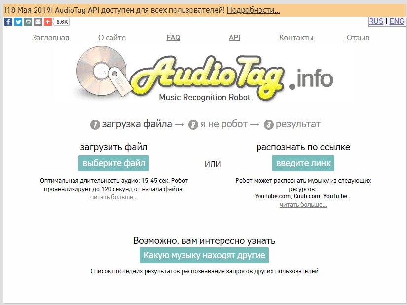 Сервис AudioTag.info прост в использовании. Найти музыку по звуку можно пойти двумя способами: