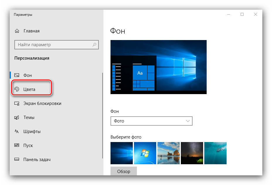 - Если мы выберем «Фото», ниже можем указать одно из стандартных изображений, которое будет использоваться как фон рабочего стола или, нажав кнопку «Обзор», выбрать другой рисунок. Это может быть любое изображение в формате JPEG, BMP или PNG.