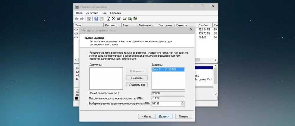 - После того как запустится окно расширения тома, жмем «Далее» и следуем указаниям, пока не перенесем свободное пространство.