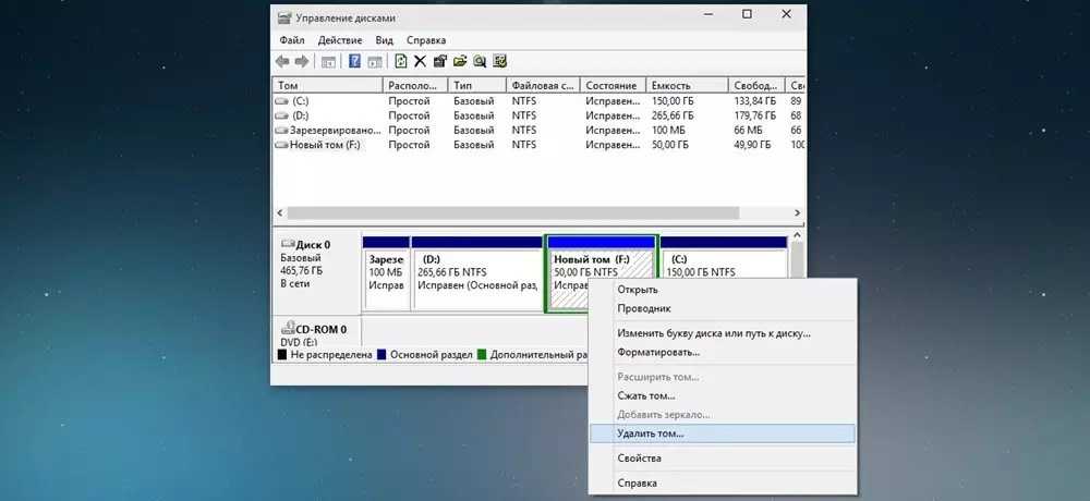 Удаление выполняется предельно просто — нажмите ПКМ по нужному разделу и выберите «Удалить том», а затем подтвердите удаление.