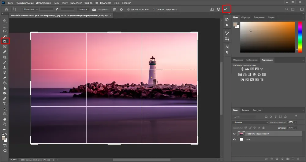 Данный инструмент способен не только улучшить композицию, но и отсечь лишние объекты, случайно попавшие в кадр.