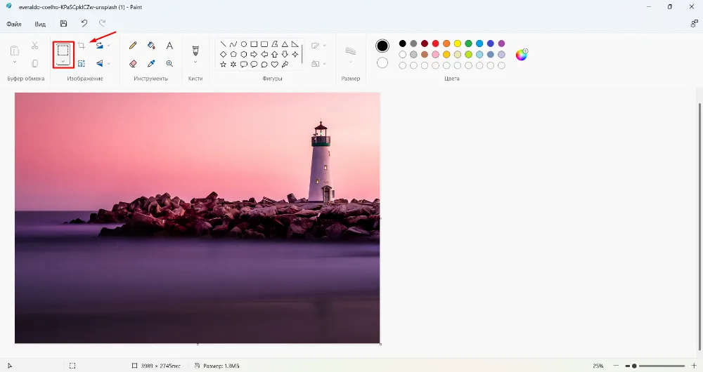 Фотография загрузится в программу Paint и можно приступать к ее обрезке.