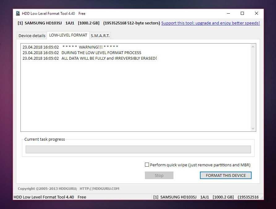 Вторая программа для очистки флешки – HDD Low Level Format Tool. Скачать и установить ее, как и в предыдущем случае, можно с сайта разработчика. Есть даже версия, которая работает без установки.