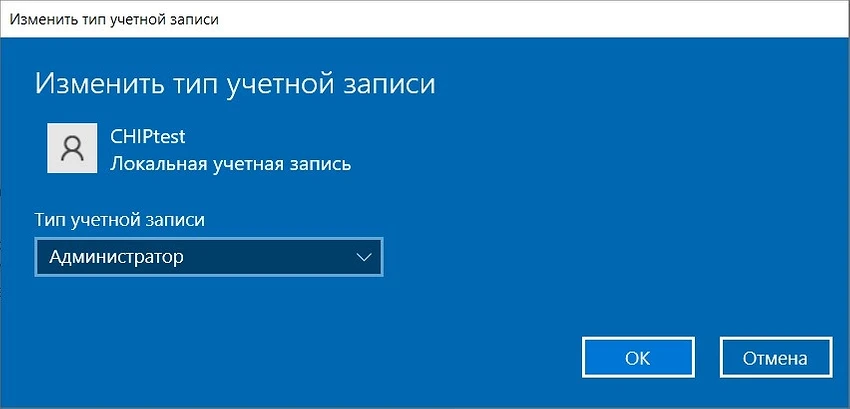 - Установите тип учетной записи «Администратор». Затем выберите ОК.