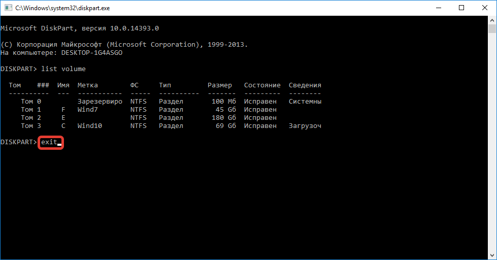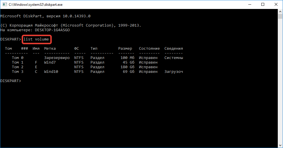 - Определить букву системного диска. Это можно сделать при помощи последовательного выполнения команд diskpart и list volume.