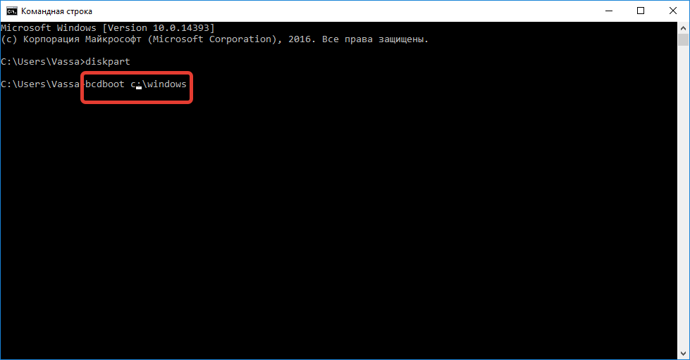 - Запустить откат, прописав в «Командной строке» bcdboot х:\windows, где X – буква системного диска.