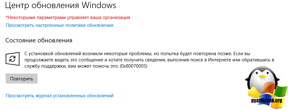 С установкой обновлений возникли некоторые проблемы, но попытка будет повторена позже. Если вы продолжаете видеть это сообщение и хотите получить сведения, выполнив поиск в Интернете или обратившись в службу поддержки, вам может помочь это: (0x80070005)