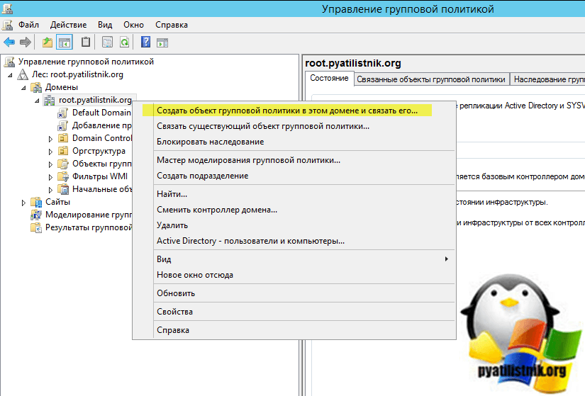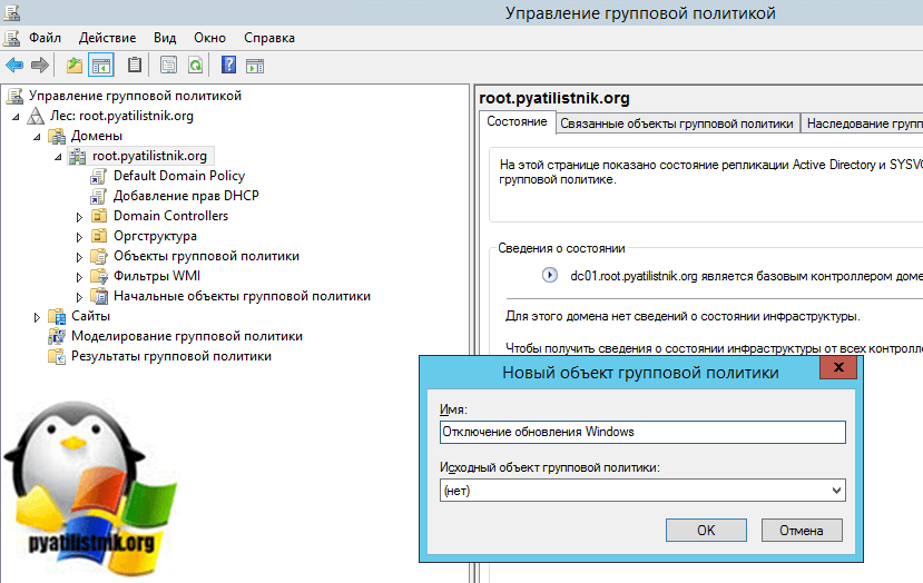В своем примере я буду отключать обновления для Windows 10 и Windows Server, но все действия подойдут и для других версий. Откройте редактор групповой политики, выберите нужную организационную единицу, я буду это делать на уровне корня домена. Щелкаем правым кликом и создаем новую групповую политику.