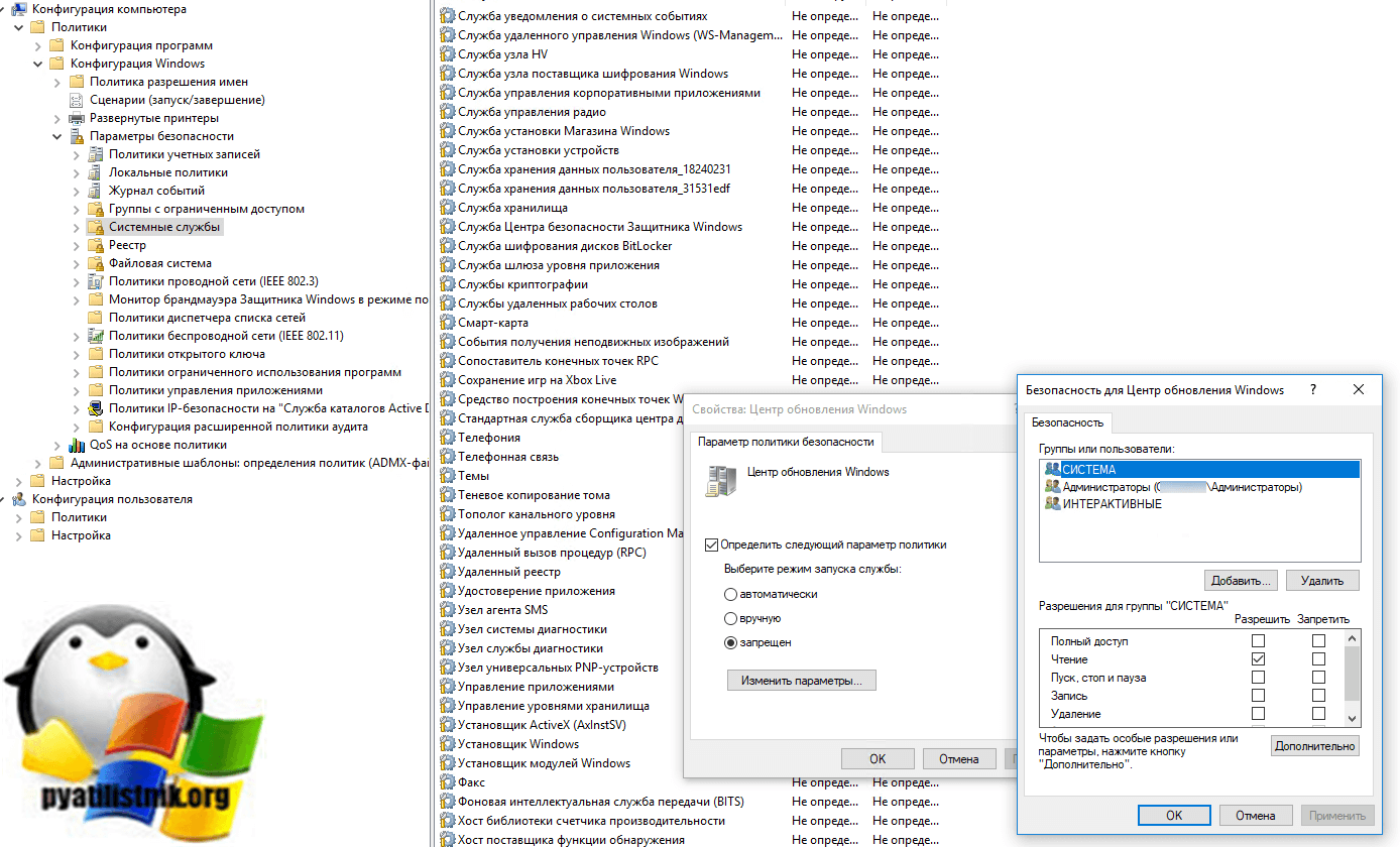 Найдите там службы «Центр обновления Windows (wuauserv)». Откройте ее свойства. Выставите тип запуска «Запрещен» и далее кнопку «Изменить параметры». Тут вам необходимо отнять права на запуск ее у системы и администраторов компьютера.