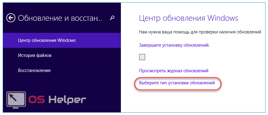 - В открывшемся окне кликаем на строку «Выберите тип установки обновлений».