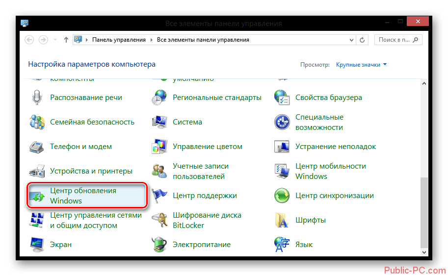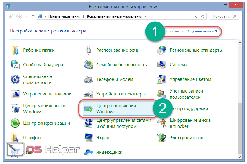 - В верхнем правом углу открывшегося окна выбираем стиль просмотра «Крупные значки». В сформированном списке ищем и открываем пункт «Центр обновления».