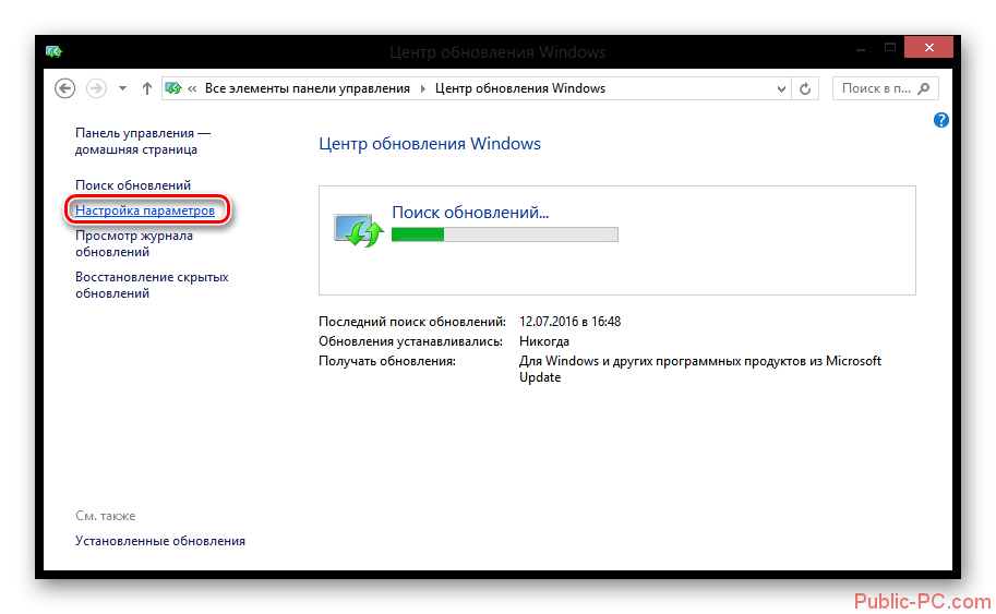 - Выберите раздел «Центр обновления Windows», после чего в появившемся окне кликните на разделе «Настройка параметров».