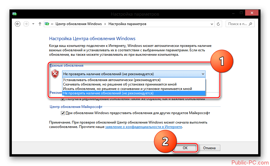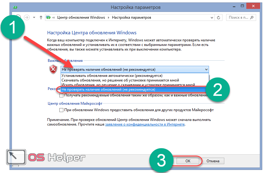 Этот способ полностью отключает поиск обновлений на компьютере или ноутбуке под управлением Виндовс 8, поэтому они больше не запустятся.