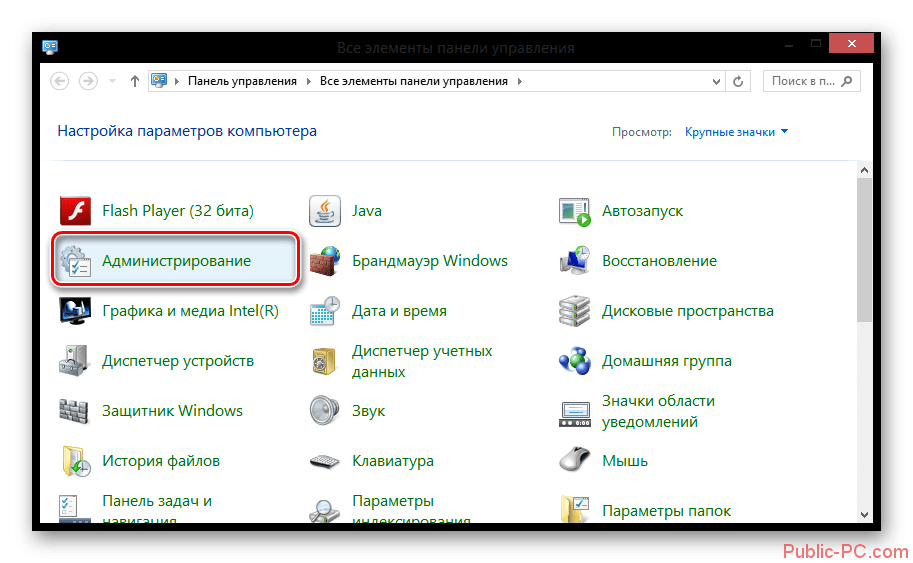- Войдите в «Панель управления», выберите «Администрирование».