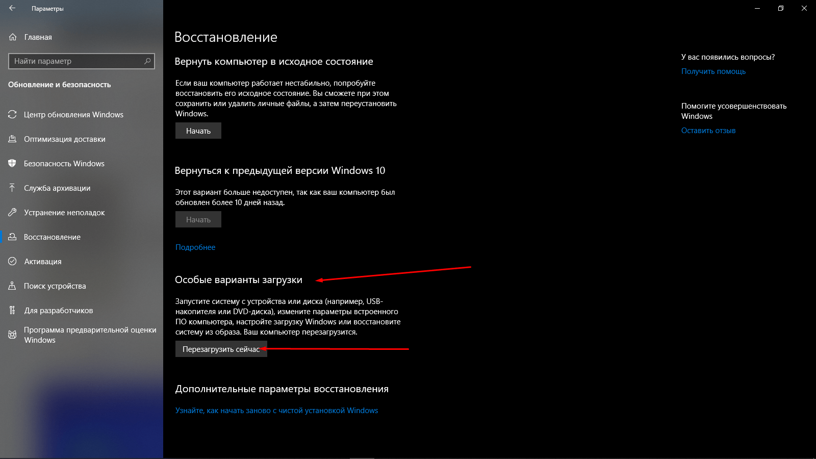 Вот как действовать во втором случае – открываю «Параметры» нажатием на комбинацию Win + I, перехожу в категорию «Обновление и безопасность», открываю раздел «Восстановление». Чуть прокрутив вниз, нахожу «Особые варианты загрузки» и кнопку «Перезагрузить сейчас» — жму по ней.