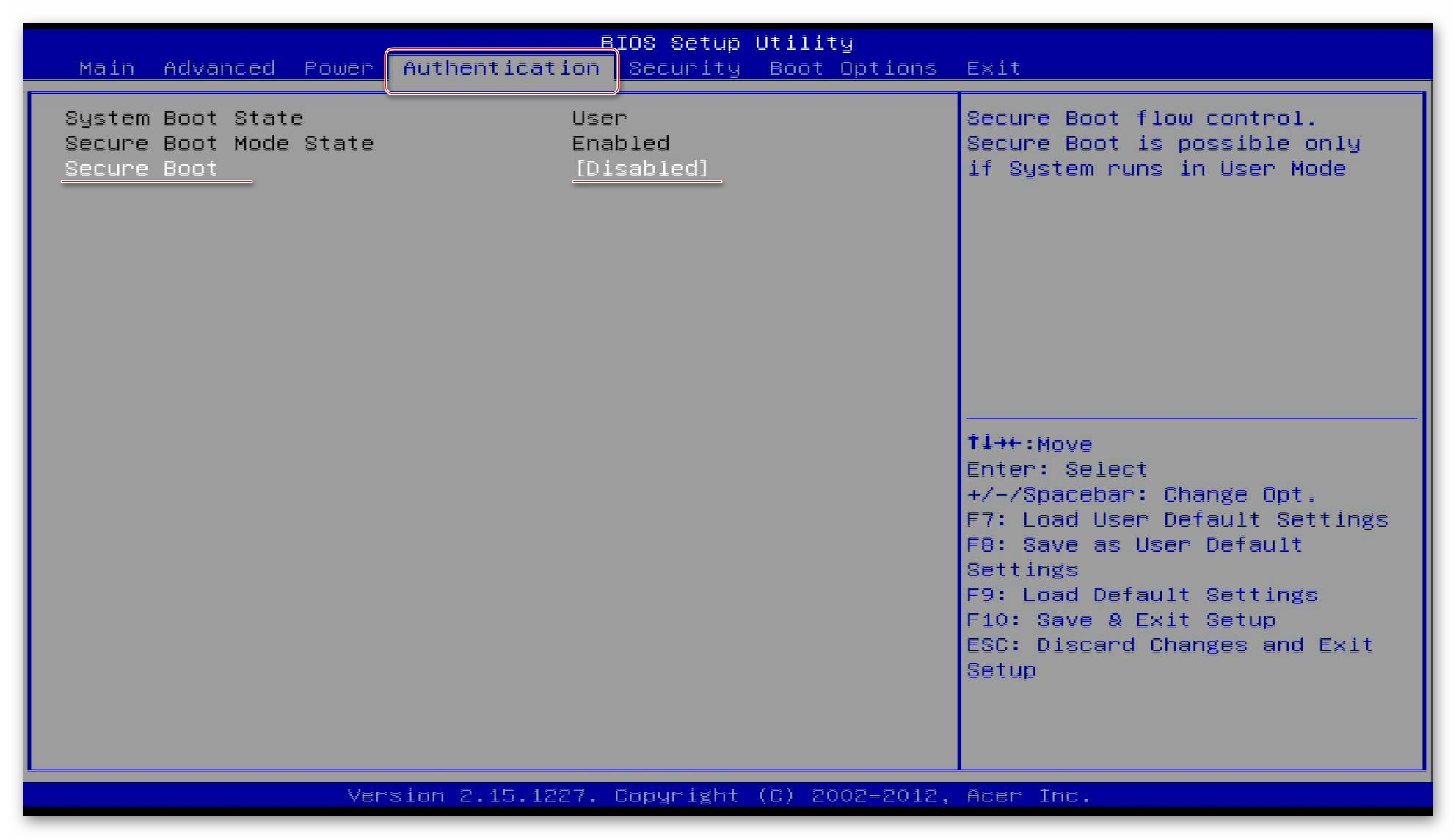В компьютерах Acer путь к необходимому параметру отличается. Он находится во вкладке Authentication, в котором тоже нужно перевести значение. При необходимости надо переключить режим загрузки на «CSM» и установить «Legacy Mode» вместо UEFI.