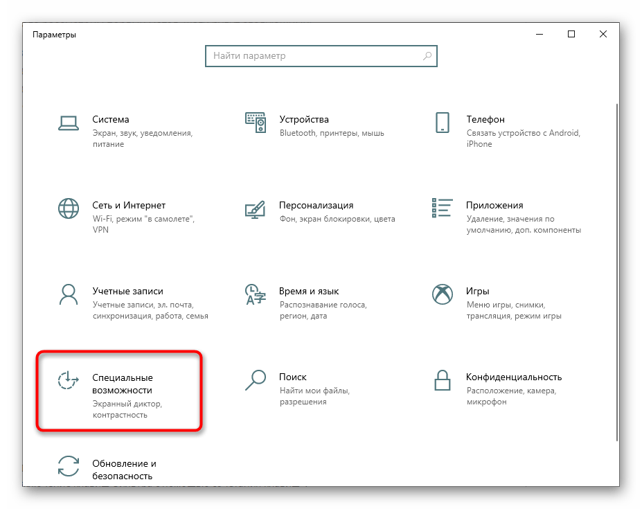 - Откройте панель управления Windows 10. Выберите категорию «Специальные возможности».