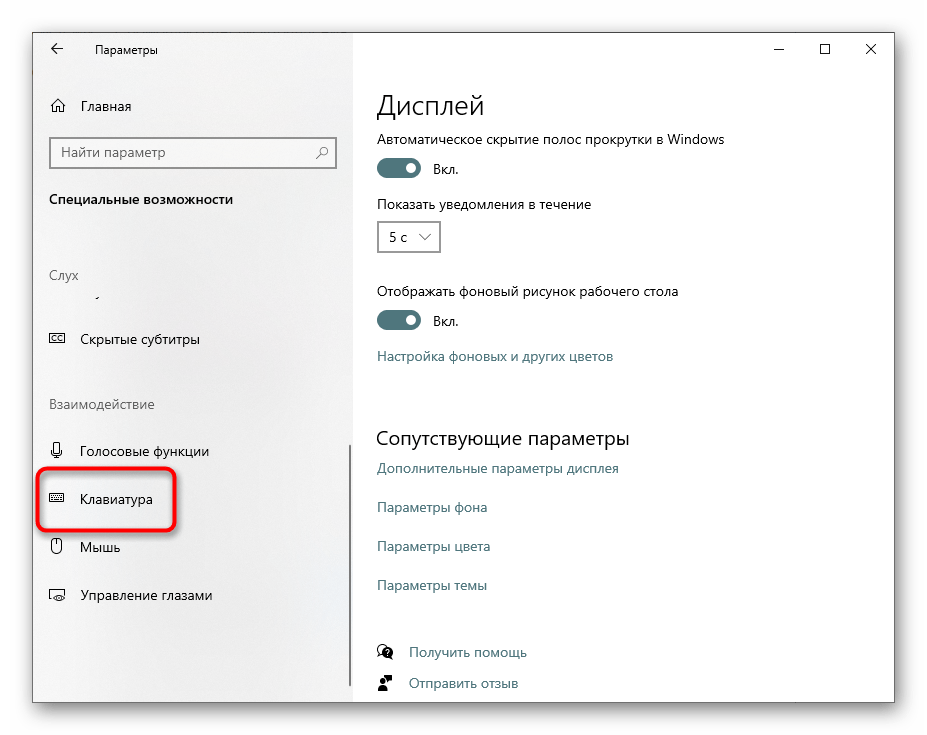 - Открываем «Специальные возможности» и переходим во вкладку «Клавиатура».