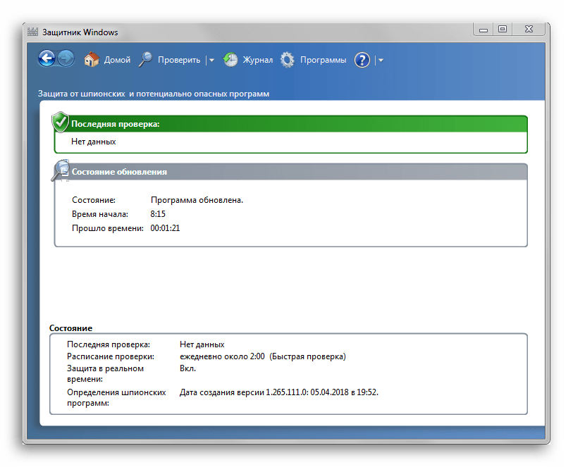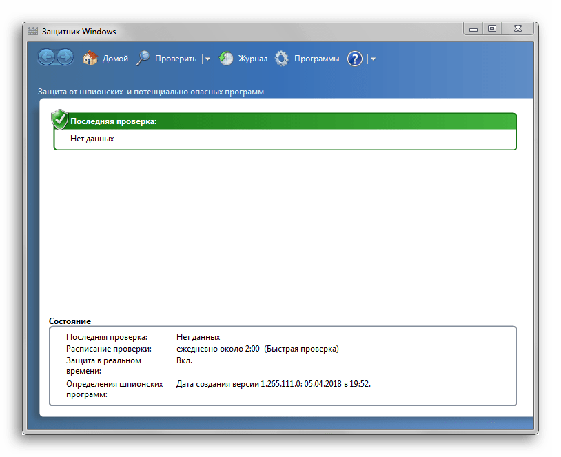Главное окошко Защитника Windows 7 приведено на рисунке ниже