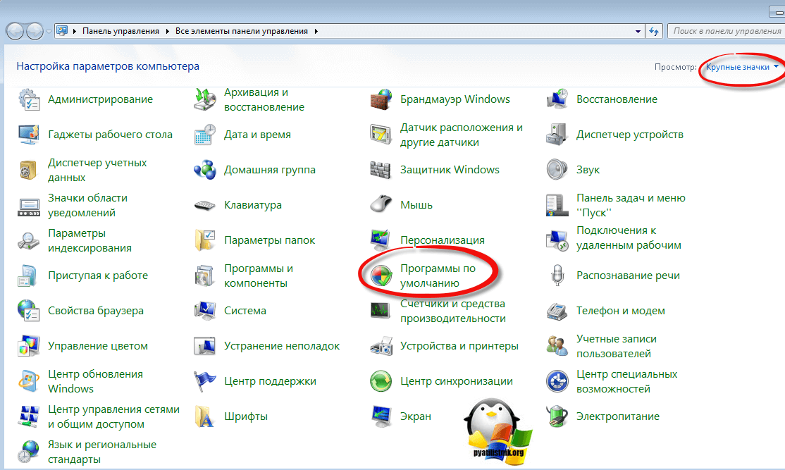 После чего в пуске просмотр ставим Крупные значки, чтобы все было удобно, и далее ищем вот такой пункт Программы по умолчанию.