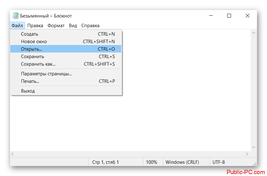 - Запустите NotePad++. В верхнем меню кликните по пункту “Файл”. Там выберите вариант “Открыть” или просто воспользуйтесь сочетанием клавиш Ctrl+O.