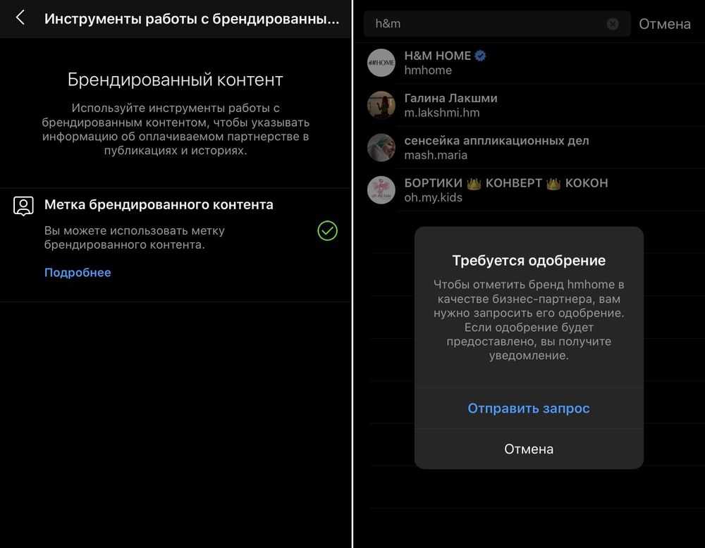 Нельзя просто так взять и отметить бренд через опцию «брендированный контент». Сначала нужно отправить запрос на одобрение