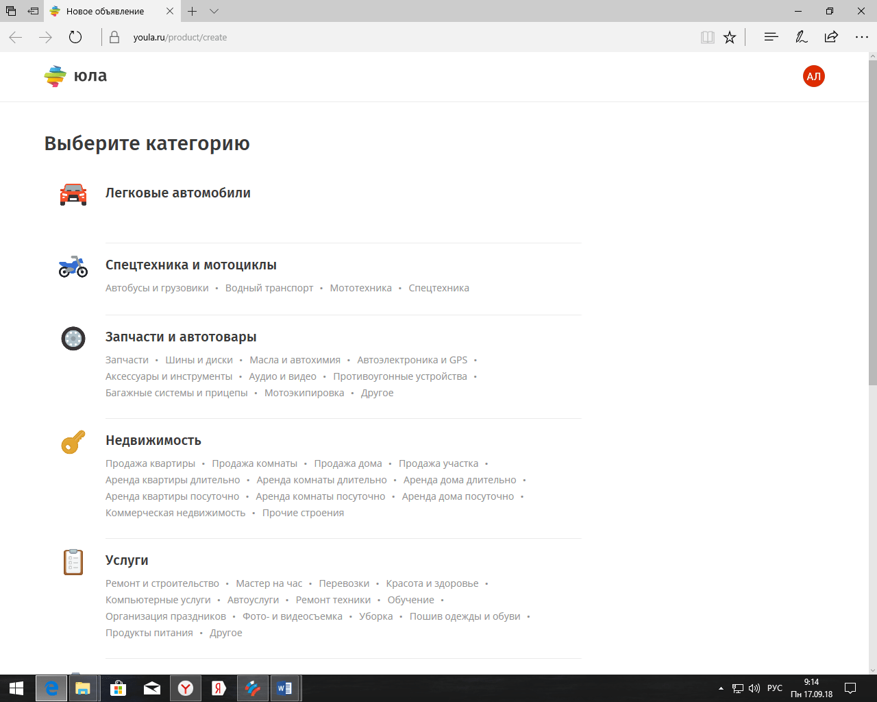 4. После выбора подходящей категории нас перекидывает в окно редактирования самого объявления.