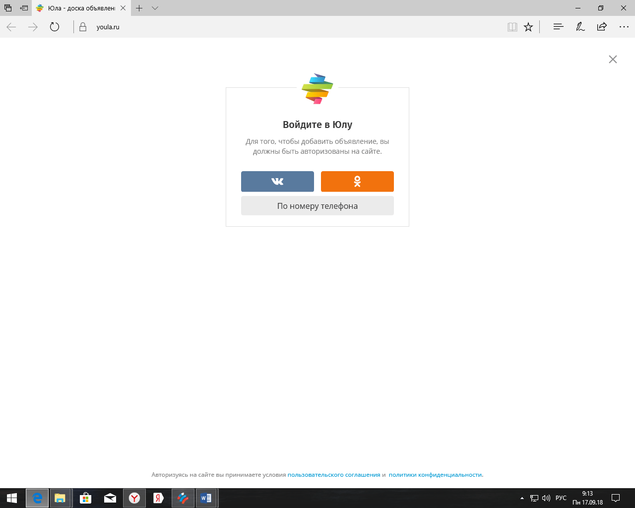 Шаг 3. Для дальнейшего размещения объявления необходимо авторизоваться на сайте. На выбор предлагается три варианта действий: зайти через свой профиль на одноклассниках, продолжить со своего аккаунта вконтакте или зарегистрироваться на сайте по номеру мобильного телефона. Можно выбрать любой удобный способ, для примера рассмотрим авторизацию по номеру мобильного телефона. Нажимаем на серый прямоугольник со словами «По номеру телефона».