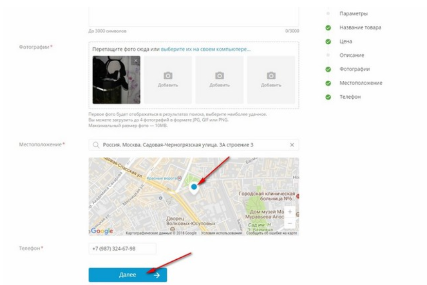 По мере заполнения полей, справа в колонке появляются зеленые галочки напротив названий тех элементов, которые вы уже заполнили. Фотография обязательна, о чем говорит красная звездочка. Так же пишем адрес. Его можно вбить вручную, или найти на карте точку и отметить с помощью нее. Необходим и телефон – по нему вам будут звонить покупатели.