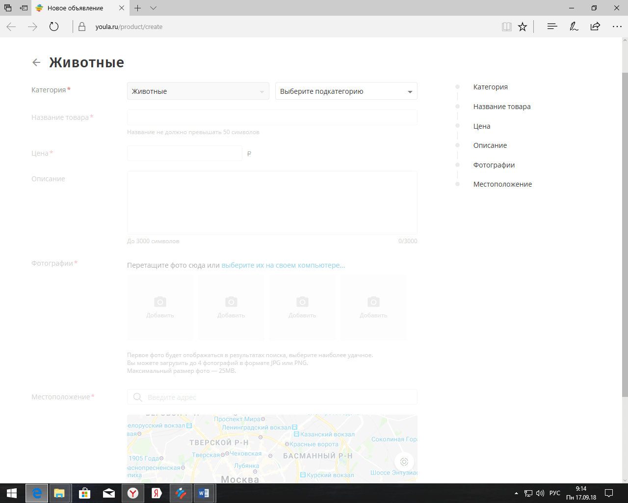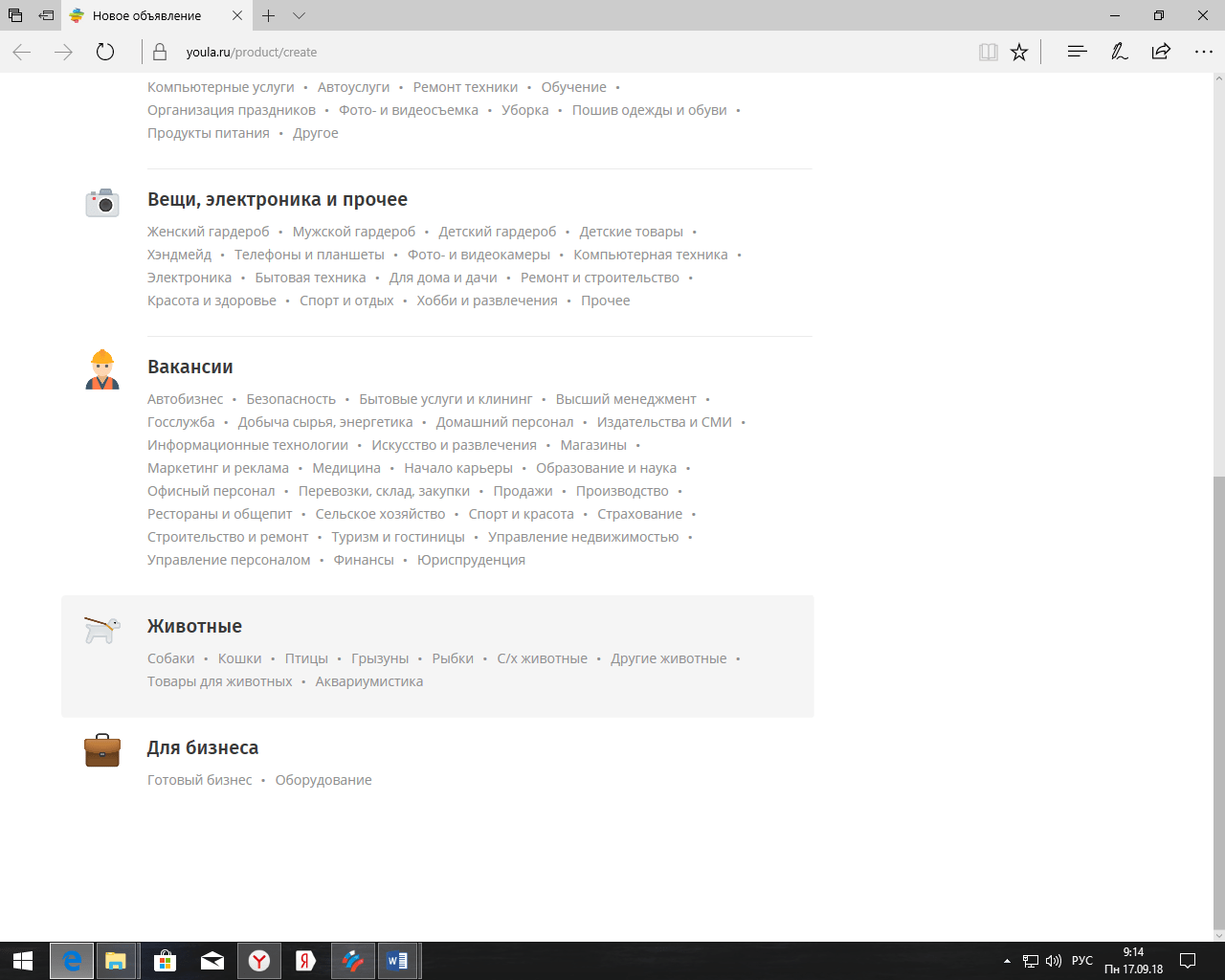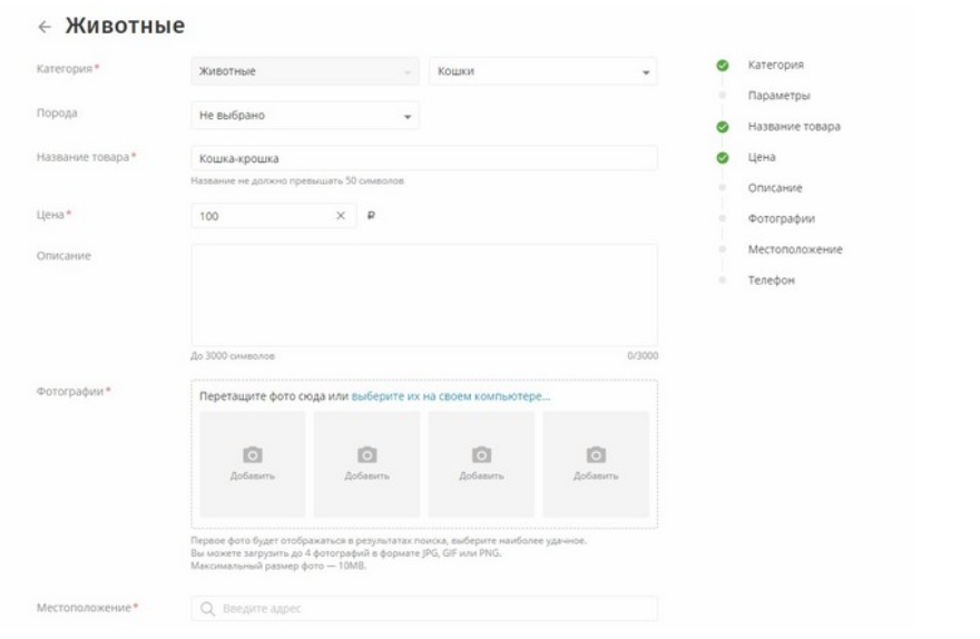 Скажем, мы продаем кошечку, а потому выбираем категорию «животные». Сразу попадаем во вкладку, где необходимо заполнить все нужные информационные поля для объявления.