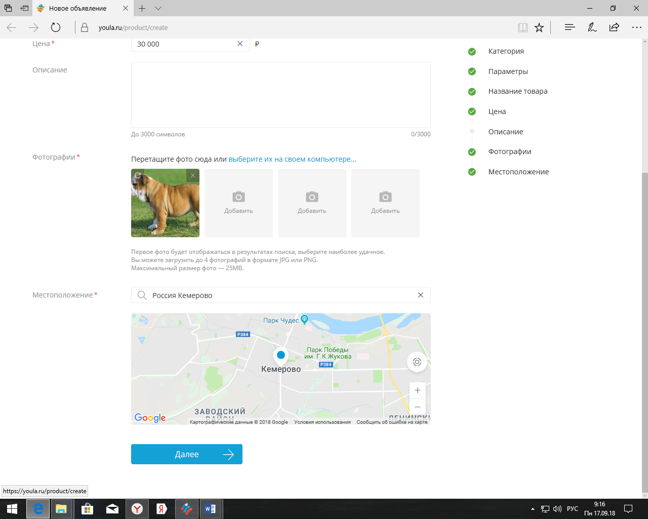 Шаг 10. В открывшейся вкладке выбираем подкатегорию «Собаки», выбираем из списка название породы, название товара, цену, загружаем фотографии, телефон, на который будут звонить покупатели, а также выбираем местоположение. При желании можно заполнить поле «Описание товара», это повысит интерес к объявлению и ускорит продажу.