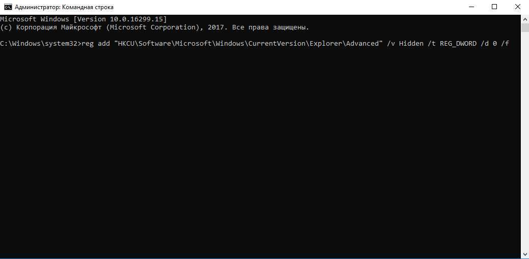 Показать скрытые системные файлы и папки:reg add “HKCUSoftwareMicrosoftWindowsCurrentVersionExplorerAdvanced” /v Hidden /t REG_DWORD /d 1 /f