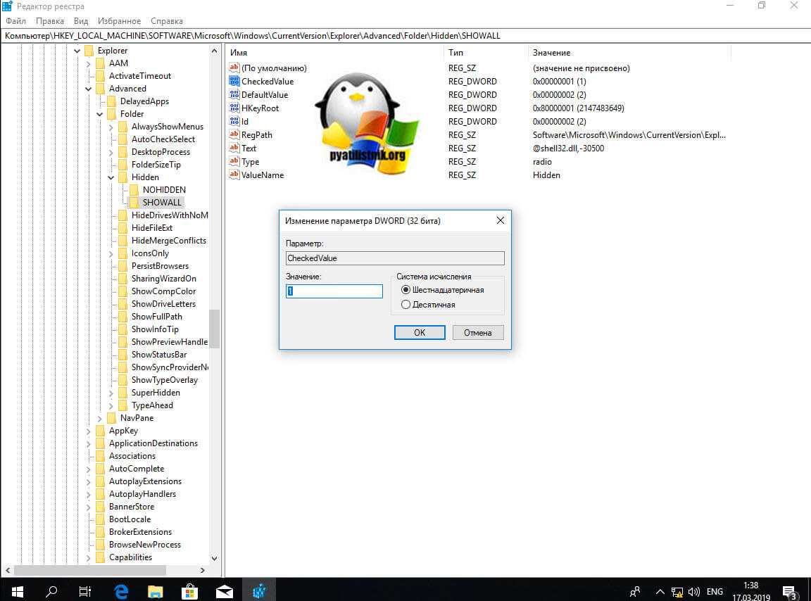 Бывает ситуация, что вы поставили нужную галку, для отображения скрытых элементов Windows 10, а они не появляются, тут вероятнее всего проблема с действием вируса. Во первых проверьте вашу систему на наличие вредоносов. Когда удостоверитесь, что их нет, откройте реестр и перейдите по пути: