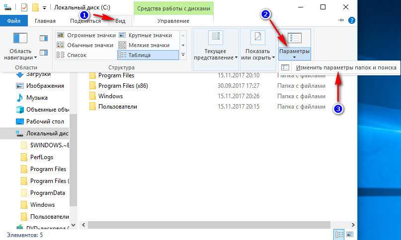 Так же, как и в первом способе, откройте Проводник Windows (Win+E) и выберите вверху вкладку Вид, после чего кликните на подменю Параметры (Изменить параметры папок и поиска).