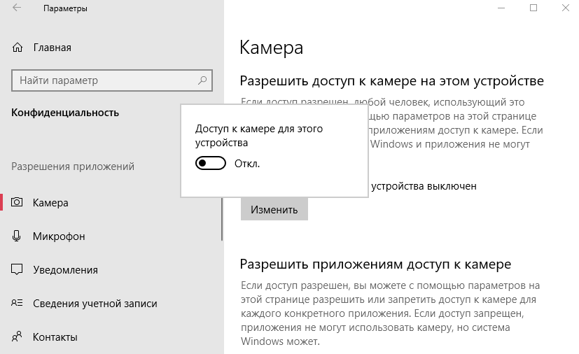 - В пункте Разрешить доступ к камере на этом устройстве нажмите кнопку Изменить, и значение пункта Доступ к камере для этого устройства измените на Отключено.