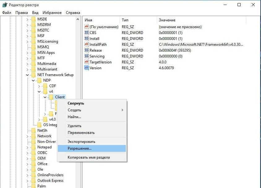 - Щелкните правой кнопкой мыши на разделе реестра и выберите из меню пункт Разрешения.
