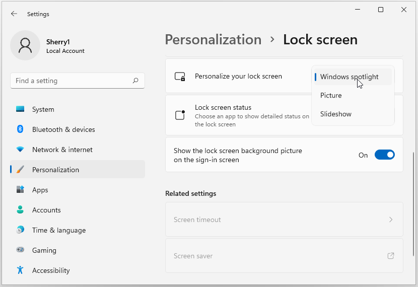 - Windows spotlight: with this option, Windows will set the lock screen wallpaper automatically.