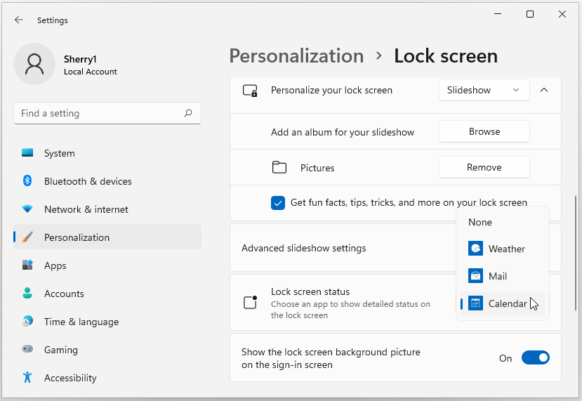 - Slideshow: with this option, you can choose multiple pictures and they will rotate on the Windows 11 lock screen at regular intervals.