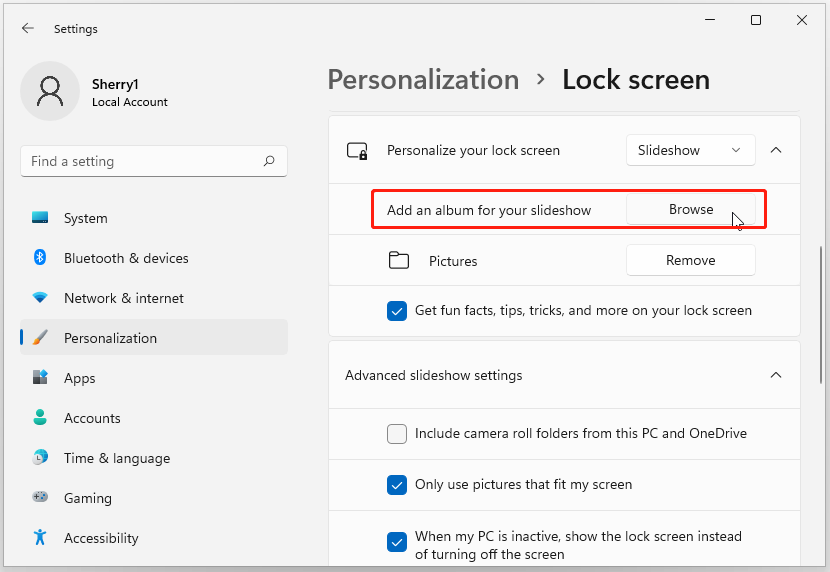 Step 4: If you select Picture in the last step, you need to click the Browse photos button and select the picture with which you want to change Windows 11 lock screen background. You can also choose from recent images. If you select Slideshow, you need to select an album that contains multiple images.