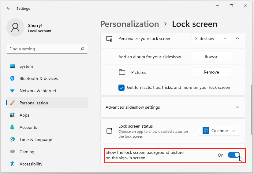 Step 6: When you click the screen or press any keys on the lock screen, it will turn to the sign-in screen, if you want to keep the background, you can turn on the option “Show the lock screen background picture on the sign-in screen”. Otherwise, keep it turned off.