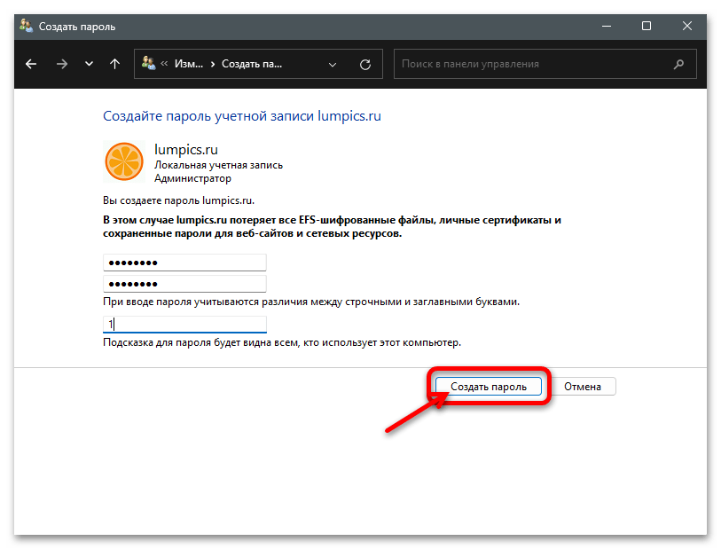 - В появившемся окне «Создание пароля» набрать код, подтвердить его, после чего – ввести подсказку на случай, если забудете его записать или потеряете записанное.