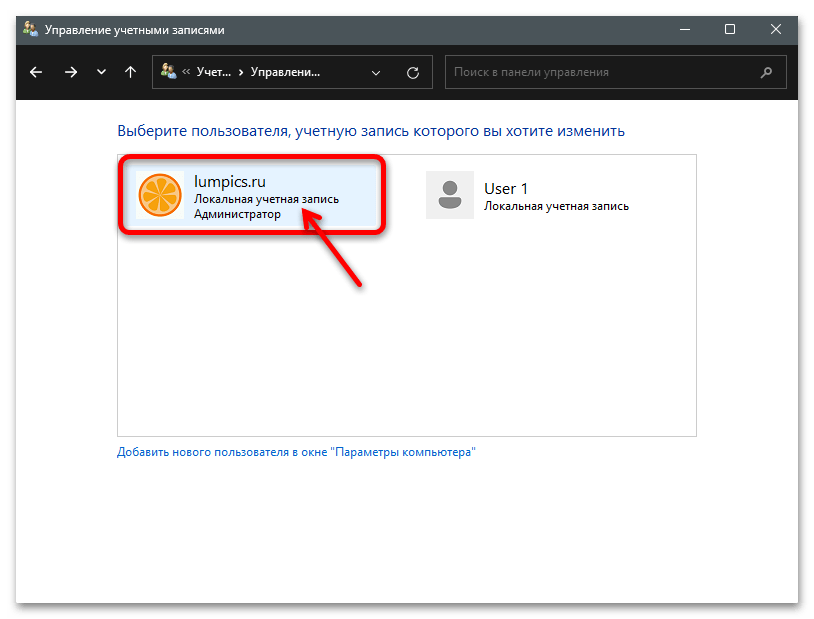 Далее должно открыться окно со всеми пользователями, которые есть в системе. В моем случае пользователь один — «USER» (он же по совместительству администратор).