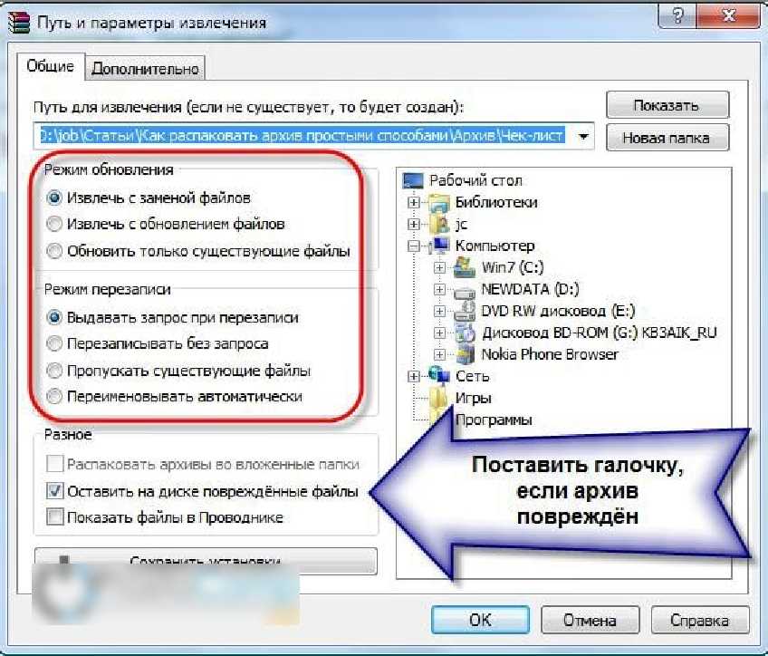 Кроме того, используя данное окно можно распаковывать поврежденные архивы. Ведь если использовать стандартные настройки, то программа будет выдавать ошибку, и распаковка будет не возможна. Но если установите флажок напротив пункта «Оставить на диске поврежденные файлы», то даже поврежденные файлы будут вытянуты из архива.