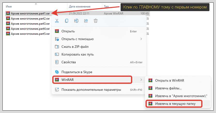 - Извлечь в текущую папку – все файлы распакуются в туда же, где и архив;